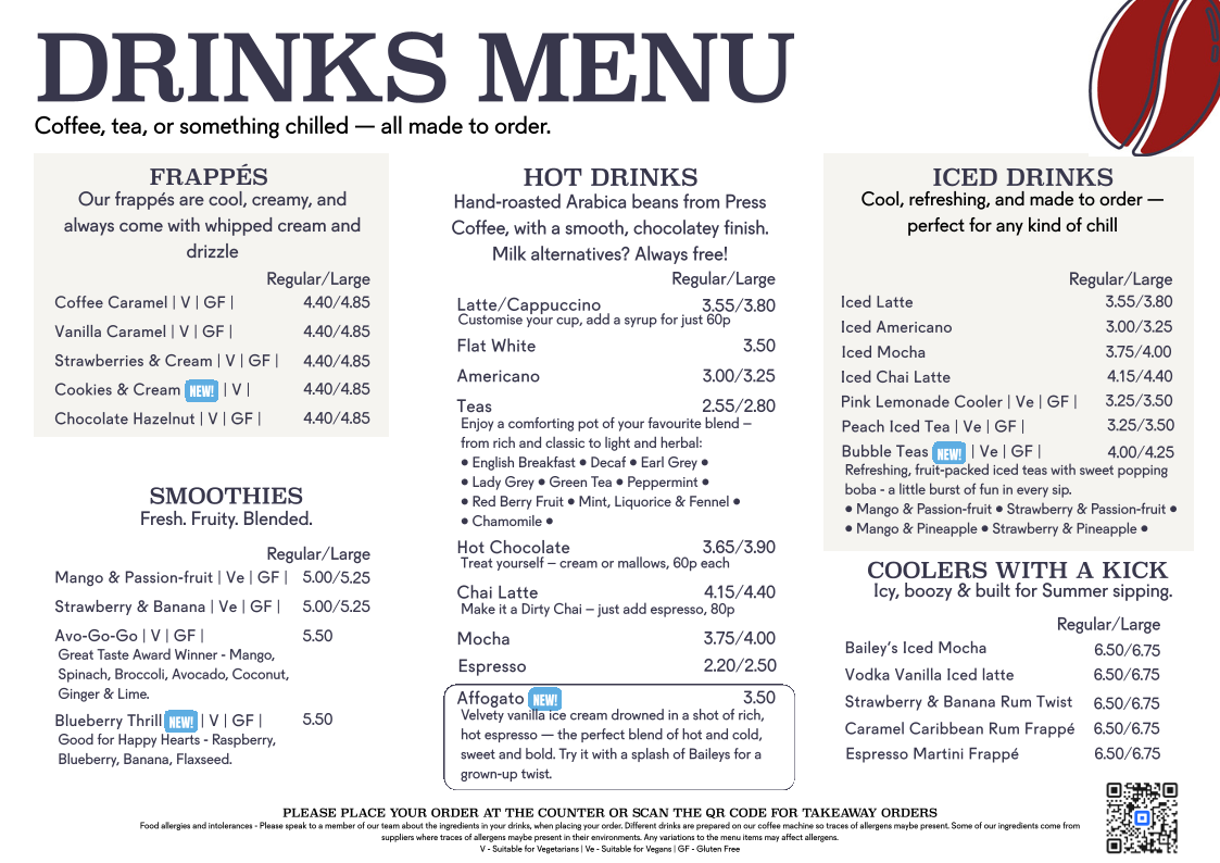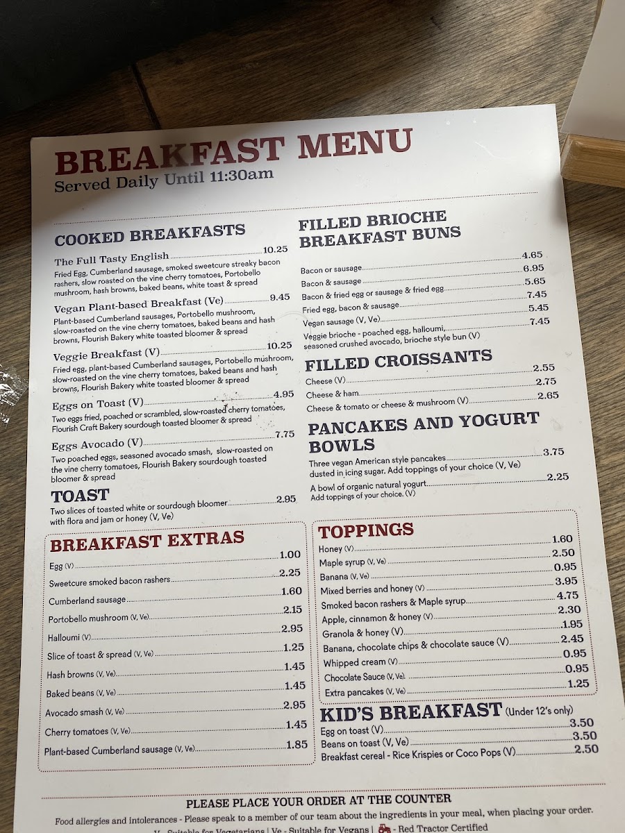 Breakfast is a delight here, with offerings like the classic Full Tasty English, a nutritious Vegan full breakfast, and indulgent waffles topped to perfection, served until 11:30 am daily. For lunch, the café features a selection of hearty dishes, from the crispy Chicken Katsu Burger to a succulent British Beef Burger, paired with crunchy salads and delicious sandwiches.
